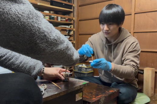さて、現代において漆工といえば絢爛(けんらん)豪華な蒔絵(まきえ)や螺鈿(らでん)を施した芸術品の存在もあってか、どこか高尚なイメージも持たれがち。しかし浅井さんいわく、かつてはいわゆる町の塗装業者のような存在だったのだそう。寺社仏閣からお椀(わん)まで幅広く手がけ、生活に寄り添った存在として多くの町にお店があったようです。ペンキの台頭もあり、戦後はそれらの数が減っていったという歴史がありますが、漆工の技術を生かせる仏壇仏具の業界に方向転換をしたパターンもあるのだとか。仏壇製造が非常に盛んなこの地域だからこその流れかもしれません。とはいえ漆は、塗料、コーティング、抗菌、接着剤を同時にこなしながらも、木の樹液であることから空気は通すというスペシャルな物質。その特別性はモノにあふれた現代でも色あせることはありません。それを肌で体感することも大事、ということで浅井さんのご好意で少し漆工の体験もさせてもらいました。